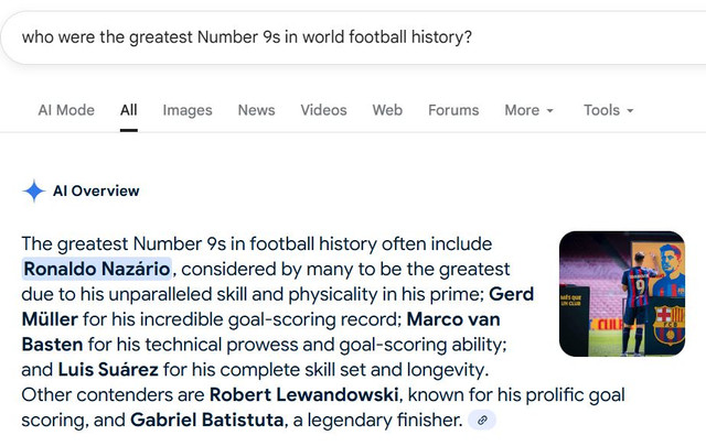 That's a good list. Except that Batistuta should be higher. Much, much, muuuuuch higher IMO. (But I could be biased on that very last front). Still, Batistuta had it all. Batigoal was his nickname, and "legendary finisher" was a great finishing touch added by the Google AI.