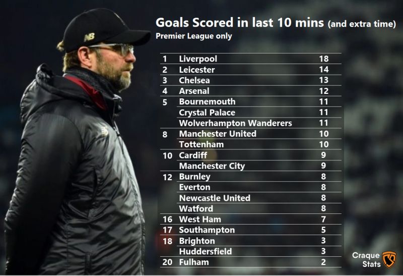 Table of Premier League teams ranked in order of goals scored from the 80th minute onwards. Click to expand.
