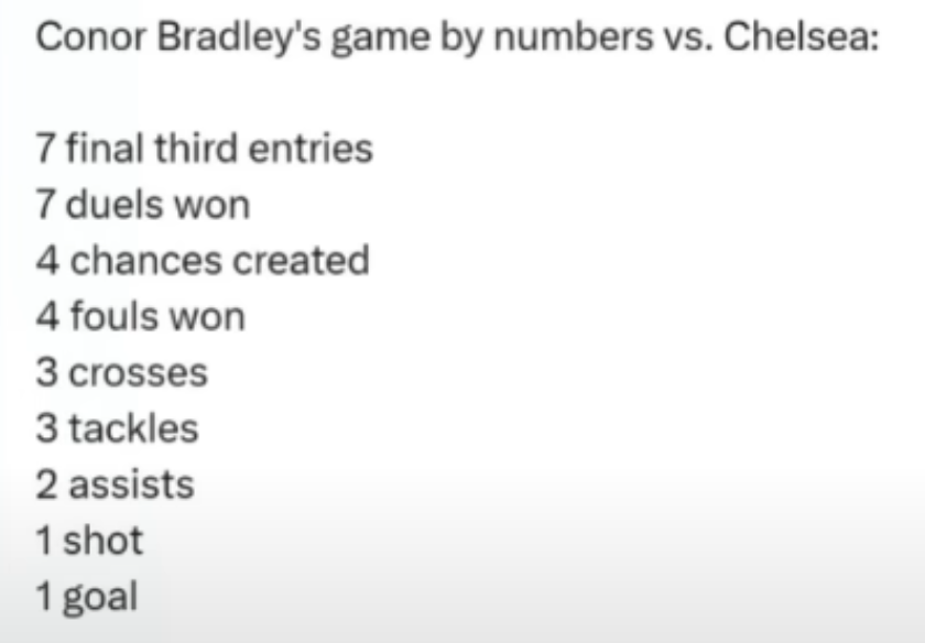 Plus Macallister is playing some great through balls from central positions so we’re completely toothless without Trent in that sense eitherA huge amount of that performance from nunez is down to Bradley for me. Just the tactic of having a right back attack the right flank opens up so much space. The inversion of Trent works wonders at times, but the pitch was so open last night due to Trent not playing