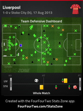 Liverpool won 16 of their 19 attempted tackles while also winning possession an additional 6 times in Stoke’s defensive half, which is an incredible number of tackles to attempt in the opposition’s half, especially when you compare it to Stoke’s efforts; they attempted just 6 tackles in Liverpool’s half, winning just 3.
