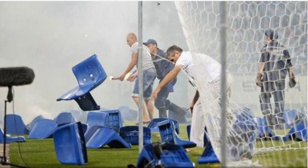 As Dnipro attacked in the 55th minute, the rowdy fans orchestrated a mass shower of flares and seats, all of which somehow managed to avoid seriously injuring the players. The supporters weren't trying to help their own defense by making it difficult for Dnipro to score, but were protesting against their own club director Viktor Moskvitina.
