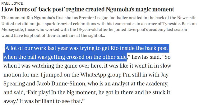 This is interesting from Paul Joyce. They appear to have worked with Ngumoha on assuming "inside the back post positions" as the play progresses on the other side. Benitez was also pretty huge on this stuff. Benitez had a great impact on Torres and made him into the most coveted striker in world football while at Liverpool. One thing Benitez kept telling Torres was to assume certain positions at certain times/segments of the game.